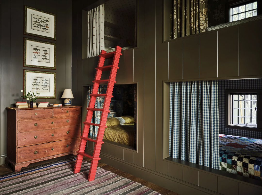 Small rooms don’t have to be white. In fact, the mountain house aesthetic shows how powerful darker spaces can be: deep greens, burgundy, even black.